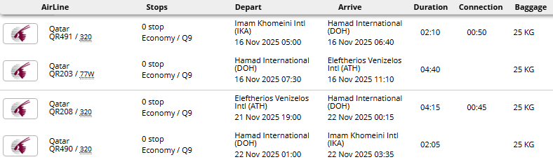 - پرواز (تهران - آتن - تهران) با توجه به ایرلاین با یک توقف در دبی، کویت، مسقط، دوحه یا استانبول