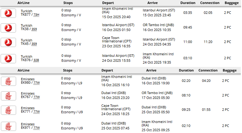 - پرواز (تهران - ژوهانسبورگ * کیپتاون - تهران) با توجه به ایرلاین با یک و یا دو توقف در رفت و برگشت