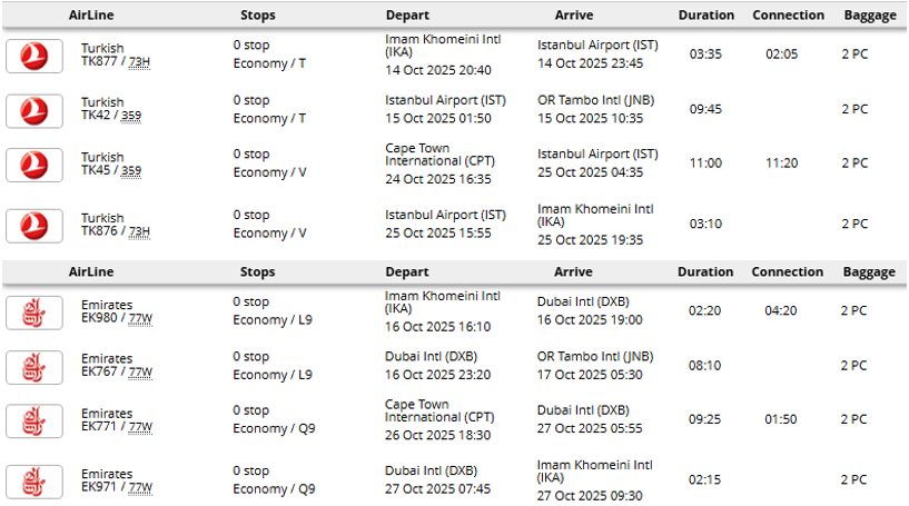 - پرواز (تهران - ژوهانسبورگ * کیپتاون - تهران) با توجه به ایرلاین با یک و یا دو توقف در رفت و برگشت