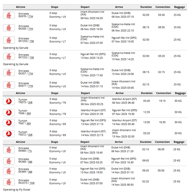 1. پرواز (تهران - بالی - تهران) با توجه به ایرلاین با توقف در دبی، کویت، مسقط، دوحه یا استانبول