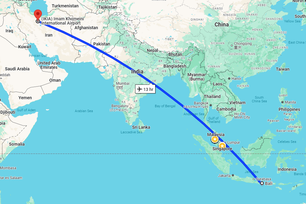 - پرواز (تهران - بالی - تهران) با توجه به ایرلاین با توقف در دبی، کویت، مسقط، دوحه یا استانبول