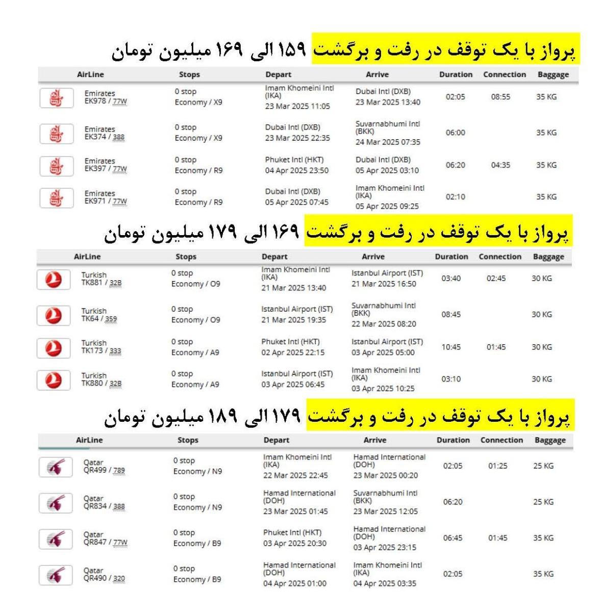 - پرواز (تهران - بانکوک * پوکت - تهران) با توجه به ایرلاین با یک توقف در دبی، کویت، مسقط، دوحه یا استانبول