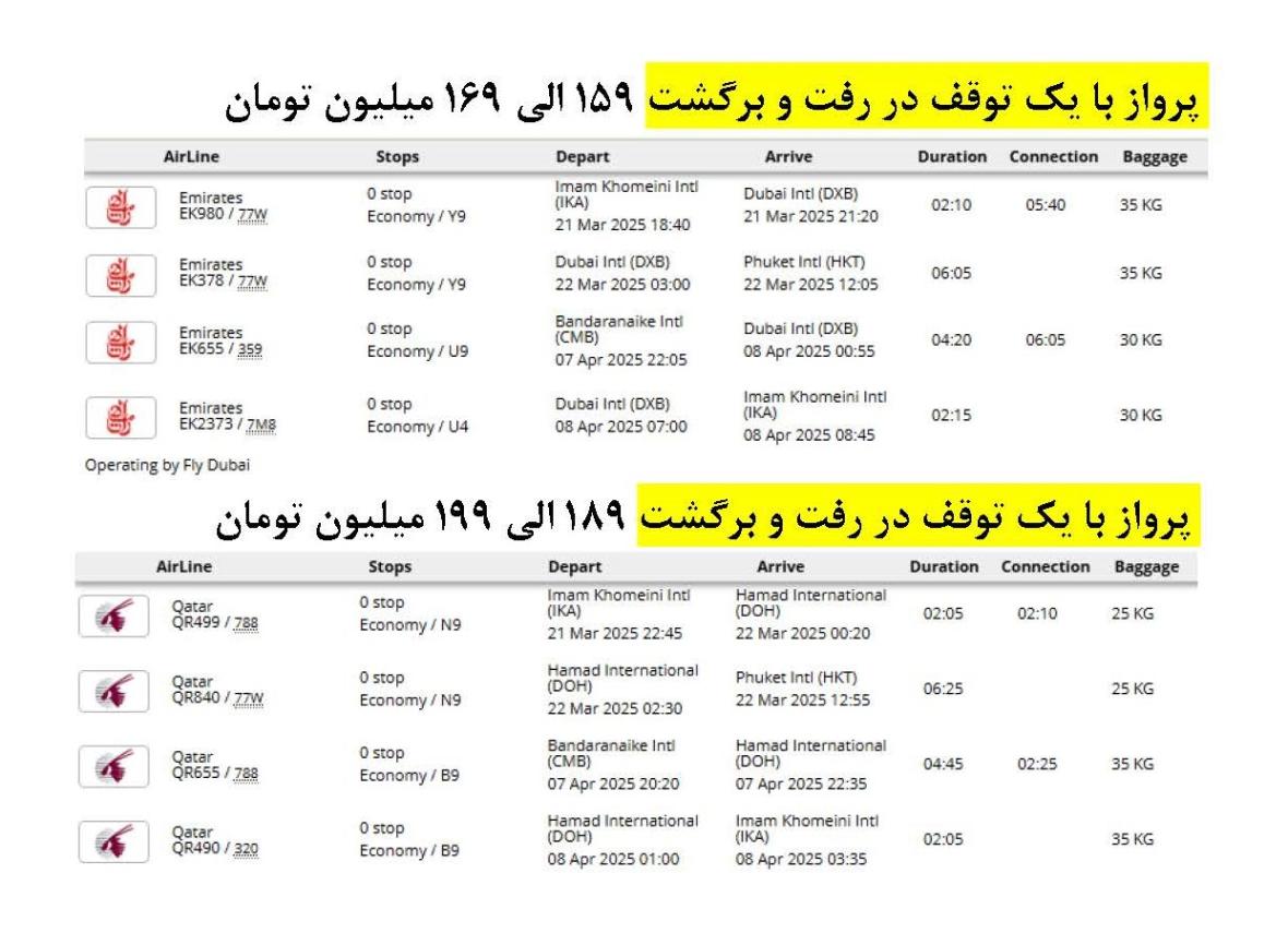 - پرواز (تهران - پوکت) * (کلمبو - تهران) با توجه به ایرلاین با حداقل یک توقف در دبی، کویت، مسقط، دوحه یا استانبول