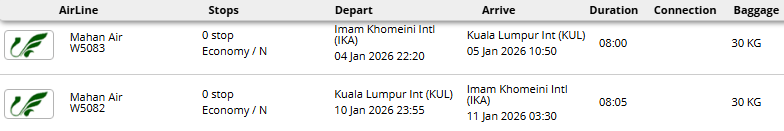 - پرواز مستقیم (تهران - کوالالامپور - تهران)