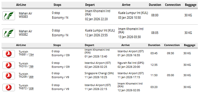 - پرواز مستقیم هواپیمایی ماهان (تهران - کوالالامپور - تهران)