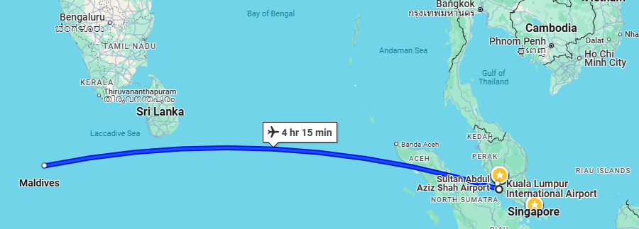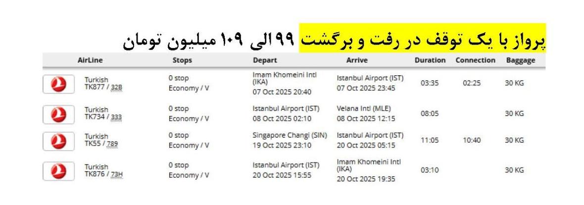 - پرواز (تهران - مالدیو * سنگاپور - تهران) با توجه به ایرلاین با حداقل یک توقف در دبی، کویت، مسقط، دوحه یا استانبول