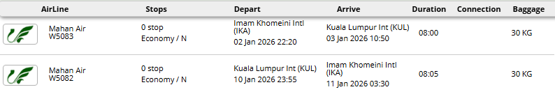 - پرواز مستقیم هواپیمایی ماهان (تهران - کوالالامپور - تهران)