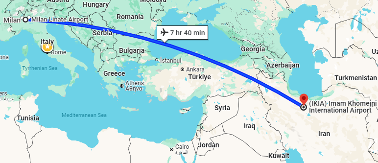 - پرواز (تهران - میلان - تهران) با توجه به ایرلاین با یک توقف در دبی، کویت، مسقط، دوحه یا استانبول