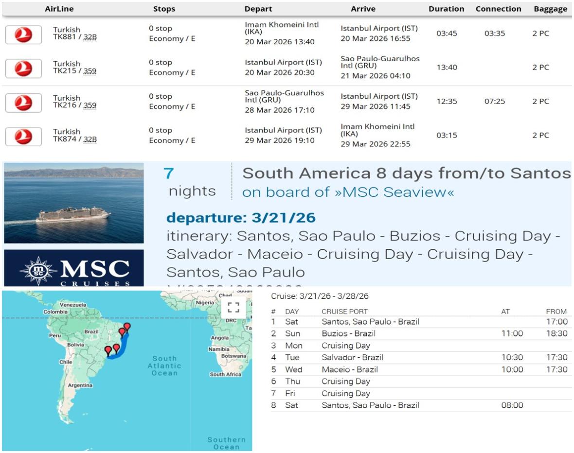 - با توجه به تعطیلات طولانی ایام نوروز، درصورت درخواست مسافر علاوه بر اقامت در کشتی امکان اقامت در شهرهای ریودوژانیرو و آبشار فوزدو ایگواسو با پرداخت اضافه بهای آن مطابق پکیج زیر وجود دارد: