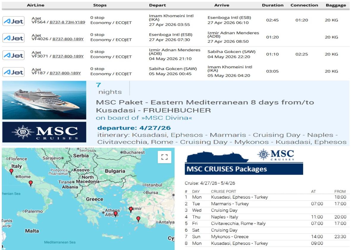 حضور در فرودگاه امام خمینی تهران حداقل 3 ساعت قبل از پرواز، مراجعه به کانتر هواپیمایی، تحویل بار و گرفتن 2 کارت پرواز (1. تهران-آنکارا 2. آنکارا-ازمیر). پرواز به سمت آنکارا ساعت 03:55 بامداد (طول پرواز حدود 3 ساعت)، ساعت 06:10 صبح ورود به فرودگاه آنکارا، حضور در سالن ترانزیت، ساعت 07:30 صبح پرواز به سمت ازمیر (طول پرواز حدود 1 و نیم ساعت)، ساعت 08:50 صبح ورود به فرودگاه ازمیر، تحویل بار و حرکت به سمت بندر کوش آداسی. مراجعه به کانتر شرکت MSC Cruises در بندر، انجام تشریفات ورود به کشتی، تحویل کابینها، وقت آزاد جهت گشتزنی در کشتی و آشنایی با امکانات تفریحی، رستورانها، بارها، فروشگاهها و سایر جذابیتهای کشتی کروز. ساعت 17:00 عصر حضور در عرشه کشتی جهت آشنایی با نکات ایمنی طی سفر با کشتی کروز، ساعت 18:00 عصر ترک بندر کوش آداسی و حرکت به سمت بندر مارماریس ترکیه.