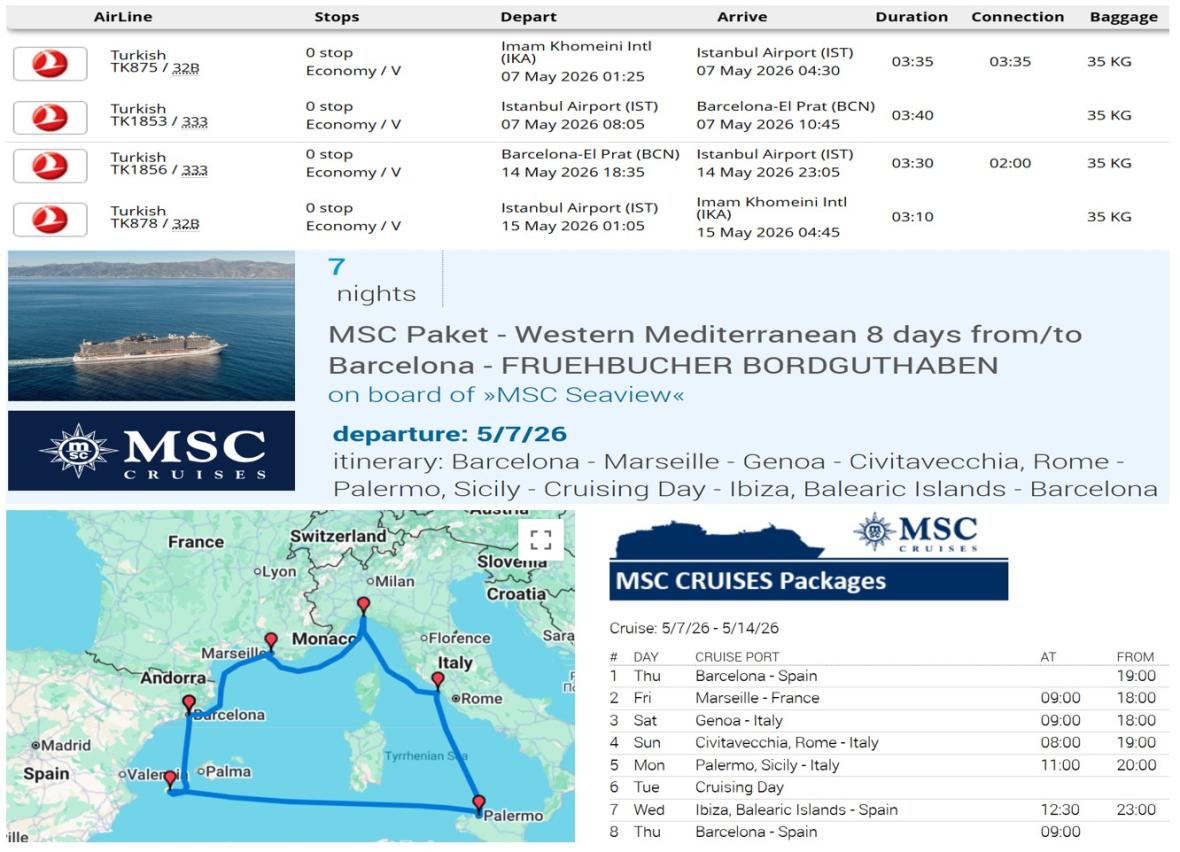 لوازم همراه: لباس شنا، عینک آفتابی، کرم ضد آفتاب، لباس مناسب هوای گرمپرواز به سمت استانبول ساعت 01:25 بامداد (طول پرواز حدود 4 ساعت). ورود به فرودگاه استانبول ساعت 04:30 بامداد به وقت محلی، حضور در سالن ترانزیت، ساعت 08:05 صبح پرواز به سمت بارسلونا (طول پرواز حدود 4 ساعت)، ساعت 10:45 صبح ورود به فرودگاه بارسلونا، حرکت به سمت بندر بارسلونا. مراجعه به کانتر شرکت MCS CRUISE در بندر، انجام تشریفات ورود به کشتی، تحویل کابینها، وقت آزاد جهت گشتزنی در کشتی و آشنایی با امکانات تفریحی، رستورانها، بارها، فروشگاهها و سایر جذابیتهای کشتی کروز. ساعت 18:00 حضور در عرشه کشتی جهت آشنایی با نکات ایمنی طی سفر با کشتی کروز، ساعت 19:00 شب ترک بندر بارسلونا و حرکت به سمت بندر مارسی فرانسه.