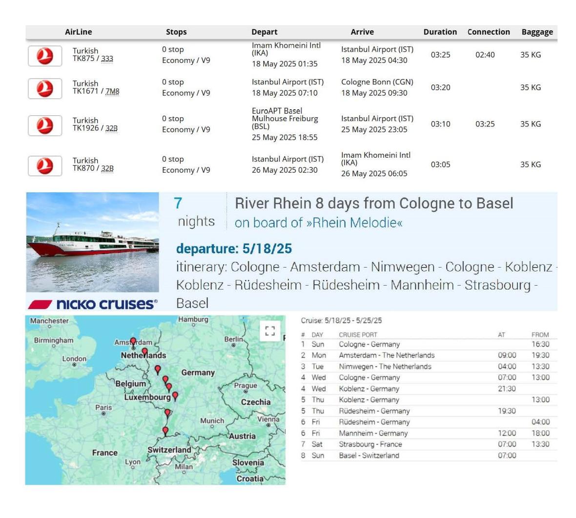 - در تاریخ های 9 شهریور و 8 مهر ماه 1404 حرکت کشتی از شهر کلن آلمان آغاز و در شهر بازل سوئیس پایان مییابد.