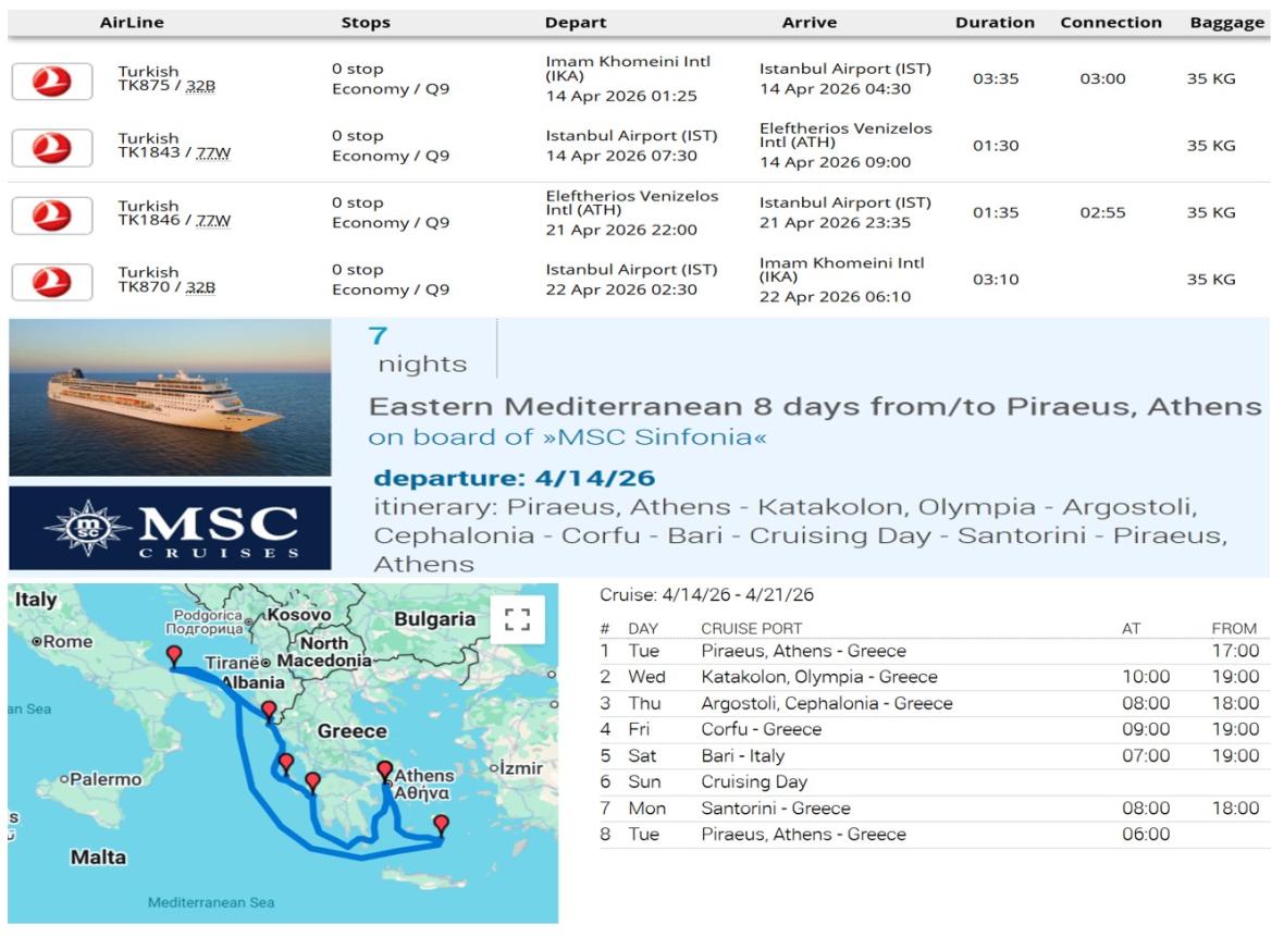 - پرواز (تهران - آتن - تهران) باتوجه به ایرلاین با یک توقف در دبی، استانبول، دوحه و ...