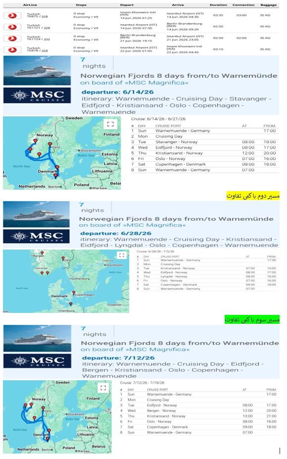 - تاریخ های 21 تیر، 18 مرداد و 15 شهریور: Warnemuende - Cruising Day - Eidfjord - Bergen - Kristiansand - Oslo - Copenhagen - Warnemuende