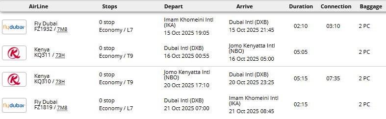 - پرواز (تهران - نایروبی - تهران) با یک توقف در دبی، شارجه، استانبول یا دوحه