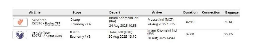 - پرواز مستقیم (تهران - مسقط * دبی - تهران)