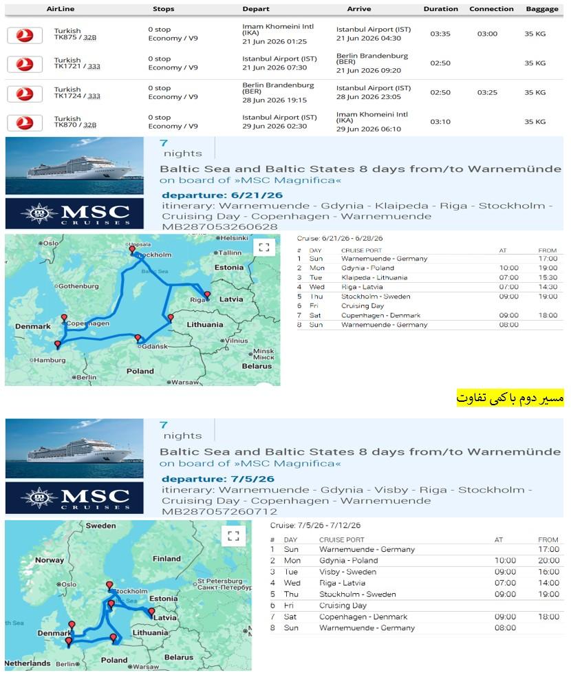 - مسیر دوم 14 و 28 تیر: Warnemuende - Gdynia - Visby - Riga - Stockholm - Cruising Day - Copenhagen - Warnemuende