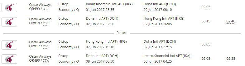 - پرواز هواپیمایی قطرایرویز (تهران-دوحه-هنگکنگ * هنگکنگ-دوحه-تهران)