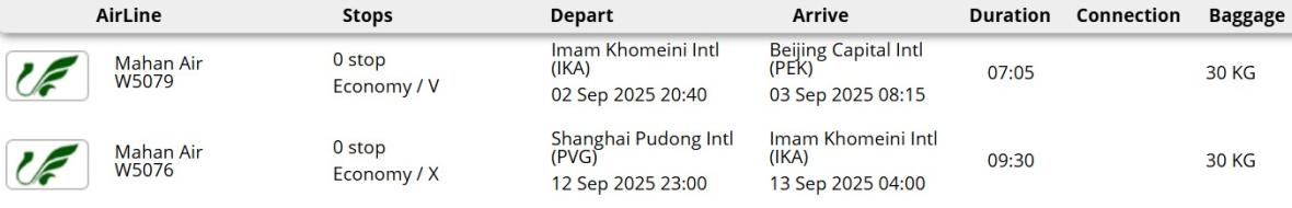 - پرواز مستقیم (تهران پکن * شانگهای تهران)