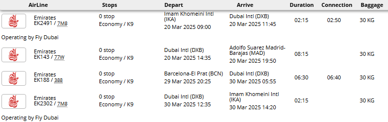 - پرواز (تهران - مادرید * بارسلون - تهران) با توجه به ایرلاین با یک توقف در دبی، کویت، مسقط، دوحه یا استانبول