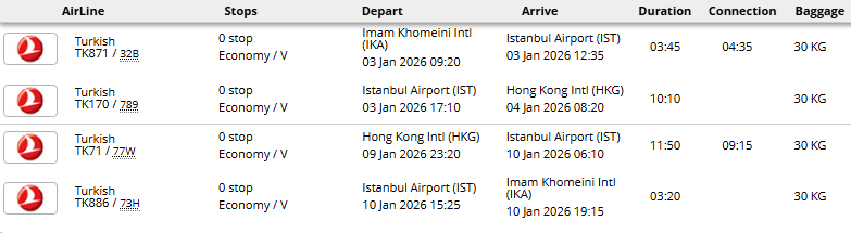 - پرواز (تهران - هنگ کنگ - تهران) با توجه به ایرلاین با یک توقف در استانبول، دوحه یا دبی