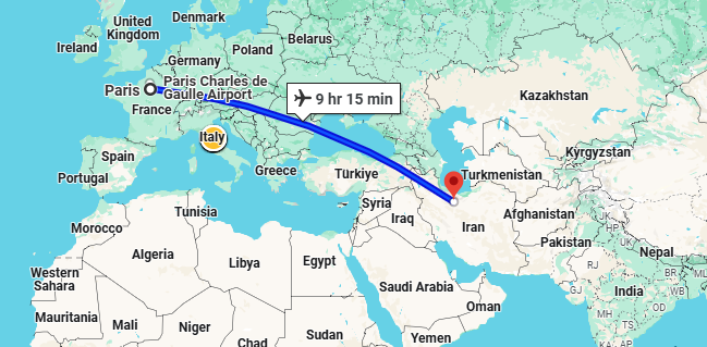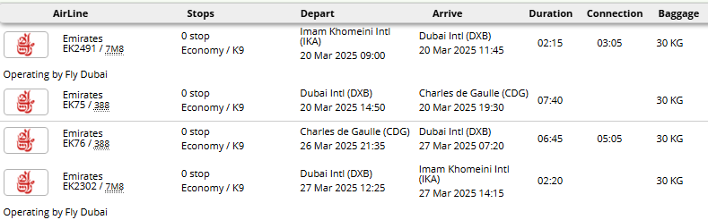 - پرواز (تهران - پاریس - تهران) با توجه به ایرلاین با یک توقف در دبی، کویت، مسقط، دوحه یا استانبول