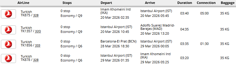 - پرواز (تهران - مادرید * بارسلون - تهران) با توجه به ایرلاین با یک توقف در دبی، کویت، مسقط، دوحه یا استانبول