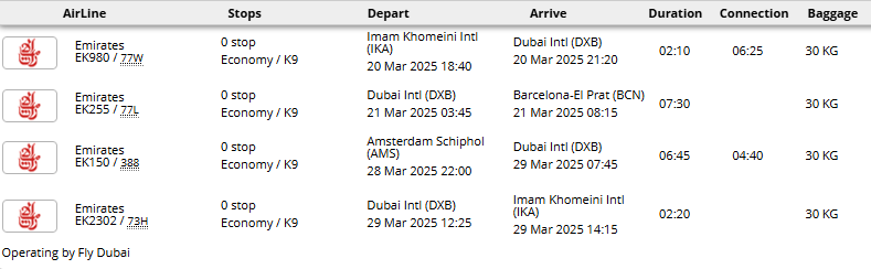 - پرواز (تهران - بارسلون * آمستردام - تهران) با توجه به ایرلاین با یک توقف در دبی، کویت، مسقط، دوحه یا استانبول