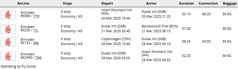- پرواز (تهران - بارسلون * کپنهاگ - تهران) با توجه به ایرلاین با یک توقف در دبی، کویت، مسقط، دوحه یا استانبول