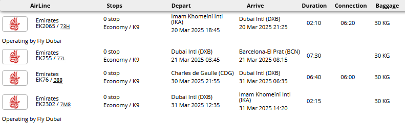 - پرواز (تهران - بارسلون * پاریس - تهران) با توجه به ایرلاین با یک توقف در دبی، کویت، مسقط، دوحه یا استانبول