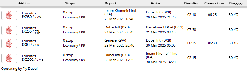 - پرواز (تهران - بارسلون * ژنو - تهران) با توجه به ایرلاین با یک توقف در دبی، کویت، مسقط، دوحه یا استانبول