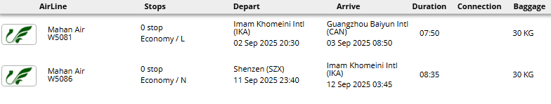 - پرواز مستقیم هواپیمایی ماهان (تهران - گوانجو * شنزن - تهران)