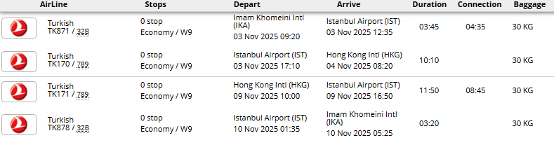 - پرواز (تهران - هنگ کنگ - تهران) با توجه به ایرلاین با یک توقف در استانبول، دوحه یا دبی