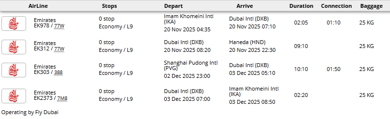 - پرواز (تهران - توکیو * شانگهای - تهران) با یک توقف در دبی، دوحه یا استانبول با توجه به ایرلاین