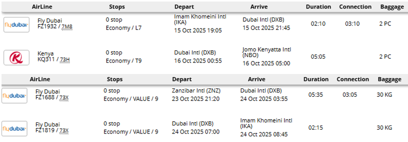 - پرواز (تهران - نایروبی * زنگبار - تهران) با یک توقف در دبی، شارجه، استانبول یا دوحه