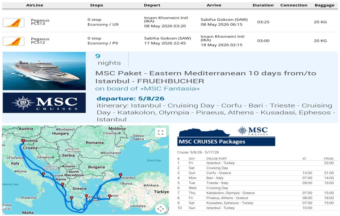 با تور لوکس ۱۰ روزه مدیترانه شرقی با کشتی کروز MSC Fantasia، سفری رویایی را برای فصول تابستان و پاییز ۱۴۰۴ تجربه کنید! این ماجراجویی بینظیر از استانبول، شهر تاریخی و پرجنبوجوش آغاز میشود و با یک روز آرامش در دریای آبی مدیترانه ادامه مییابد. در کُرفو، جزیرهای با طبیعتی مسحورکننده، توقف کرده و سپس در باری، شهر ساحلی ایتالیا، از تاریخ و غذاهای خوشمزه لذت ببرید. تریسته، با فرهنگ و معماری خاص خود، منتظر شماست. بازدید از کاتاکولون، دروازهای به المپیا، زادگاه بازیهای المپیک، و شکوه بیپایان آتن در بندر پیره، تجربهای بهیادماندنی خواهد بود. در کوشآداسی، با زیباییهای افسس آشنا شوید و سپس به استانبول بازگردید. این سفر ترکیبی از آرامش، فرهنگ و ماجراجویی است که هر لحظه آن به خاطرهای فراموشنشدنی تبدیل میشود!. در این تور کشتی کروز شما تجربه ای بی مانند از یک سفر اروپایی را با شرکت خدمات مسافرتی آوای بورالان نمایندگی رسمی فروش کمپانی عظیم کشتی های کروز MSC Cruises در ایران را بدست خواهید آورد.