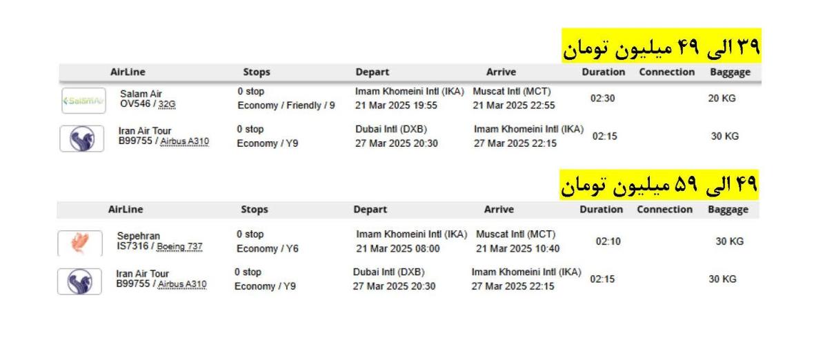 - پرواز مستقیم (تهران - مسقط * دبی - تهران)