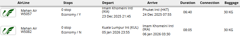 - پرواز مستقیم (تهران - پوکت * کوالالامپور - تهران)