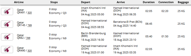- پرواز (تهران - بارسلون * برلین - تهران) با توجه به ایرلاین با یک توقف در دبی، کویت، مسقط، دوحه یا استانبول