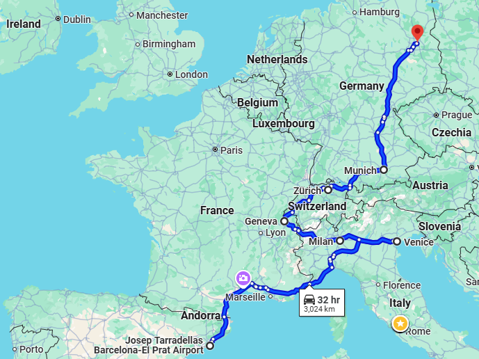 - قطار (ونیز - میلان) * (میلان - ژنو) * (ژنو - زوریخ) * (زوریخ - مونیخ) * (مونیخ - برلین)