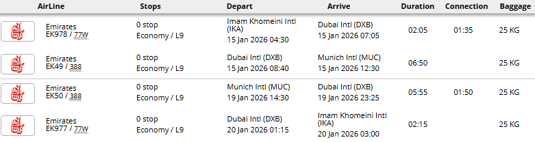 - پرواز (تهران - مونیخ - تهران) با توجه به ایرلاین با یک توقف در دبی، کویت، مسقط، دوحه یا استانبول