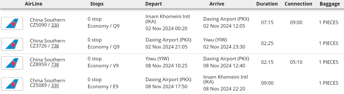 - پرواز (تهران - ایوو - تهران) با حداقل یک توقف در ارومچی یا پکن